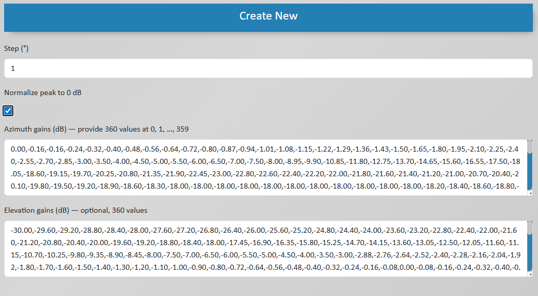 • Line 181 and Line 631 should match. This is the gain at azimuth degree of 180 and the elevation angle of -180.